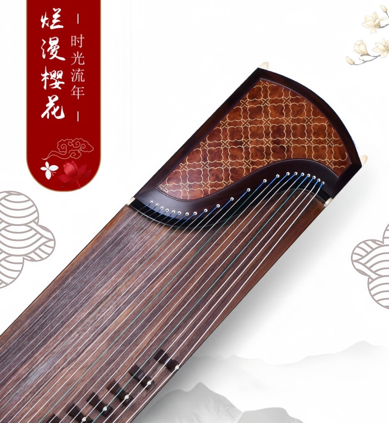 The Dunhuang 9DH695OOE "Timeless Moments" Guzheng is a beautifully crafted instrument that combines elegance and superior acoustics. Produced by the esteemed Dunhuang brand in Shanghai, this guzheng is designed with the "Timeless Moments" theme, featuring the stunning "Romantic Sakura" decoration that evokes the beauty and grace of spring. Built with premium materials like Indonesian Black Rosewood for the bridges and a Lankao-grade Paulownia wood soundboard, this guzheng delivers a clear, rich, and full tone that is perfect for both performance and practice. The zither is ideal for players who appreciate traditional craftsmanship combined with modern design. With its beautiful appearance and exceptional tonal quality, this guzheng is suitable for both intermediate and advanced musicians, as well as collectors who value fine artistry.
