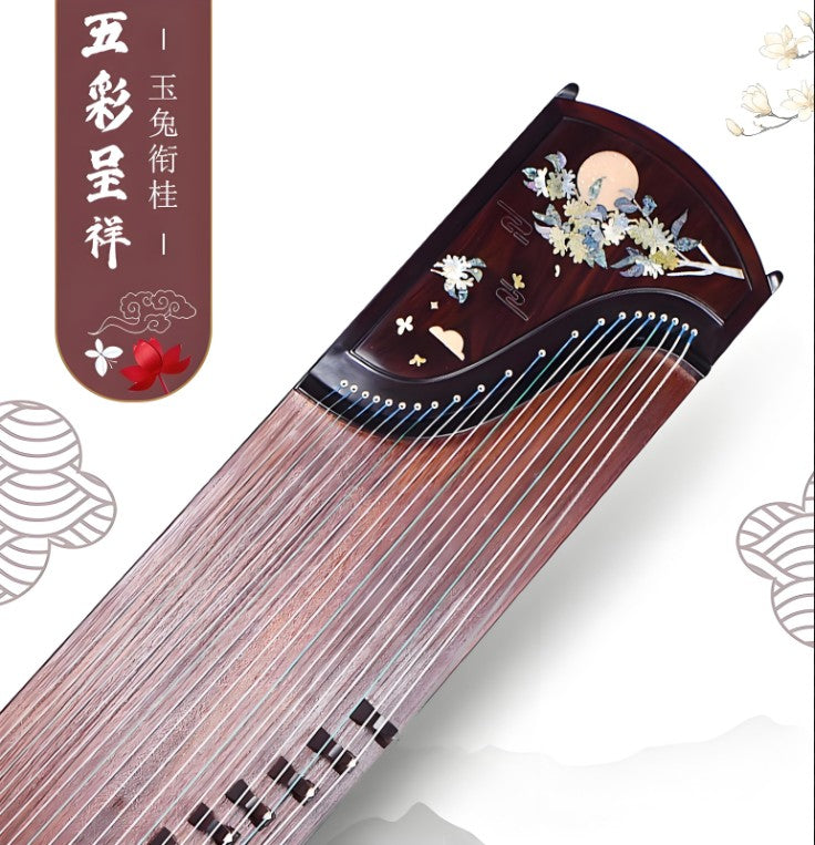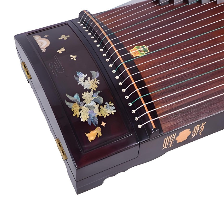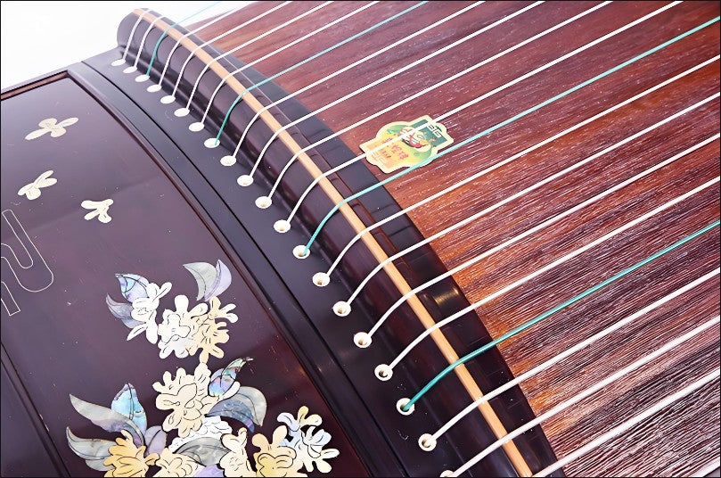 The Dunhuang Guzheng 695LDDD - Zhen Cang Yi Yun (正仓遗韵) is a masterpiece in both craftsmanship and sound, designed for connoisseurs of fine instruments. This exquisite guzheng features the premium shell inlay technique, creating intricate and delicate patterns that complement its rich, full-bodied sound.