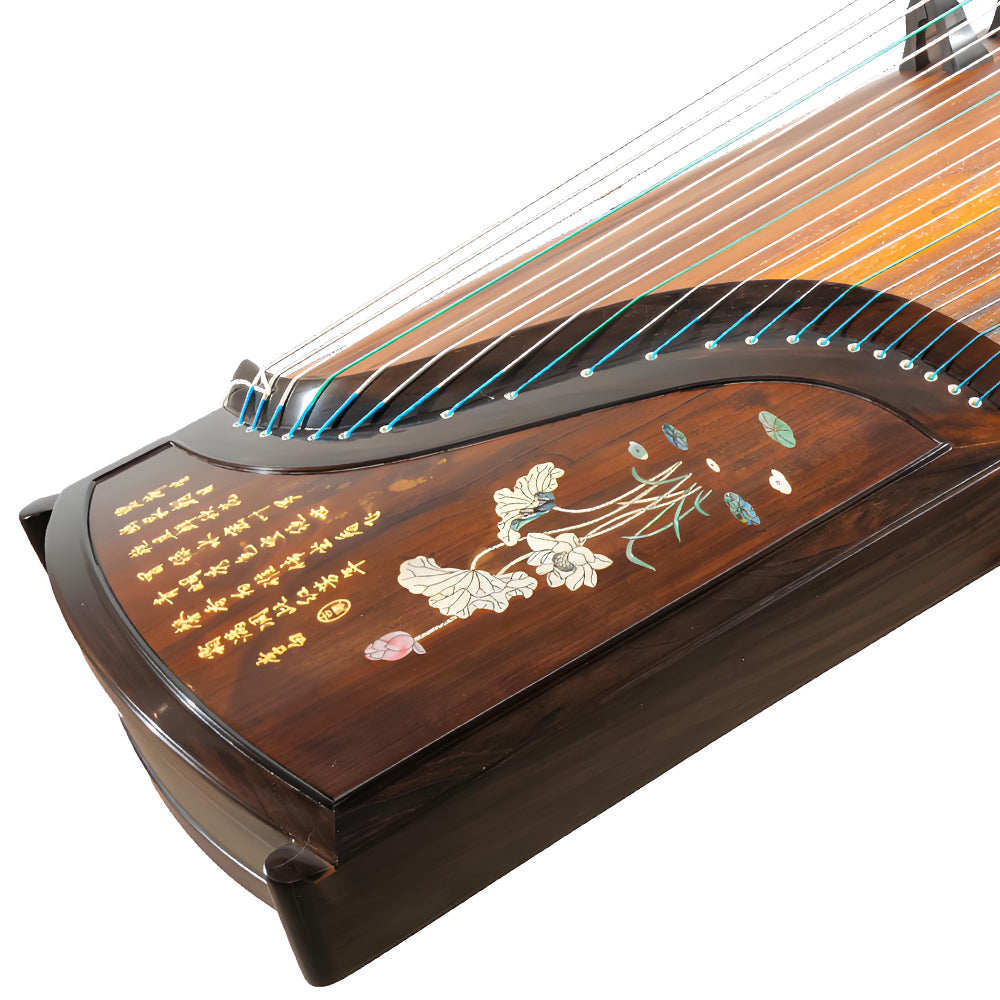 The Huali Guzheng 801GH, named “Pure Elegance,” showcases the refined artistry and tonal excellence that define the Huali craftsmanship tradition. The instrument’s frame is made of premium ebony, meticulously adorned with bone carving and mother-of-pearl inlay, creating a visual masterpiece that radiates sophistication and grace.
