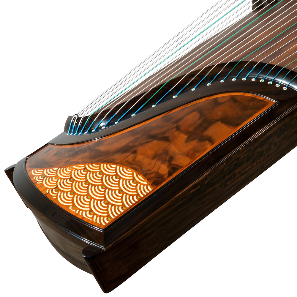 The Huali Guzheng model 805ML, named “Great Waves Wash the Sand,” embodies both artistic beauty and powerful resonance. Crafted with a solid ebony frame, this guzheng is decorated with a fine wood veneer inlay, showcasing traditional Chinese craftsmanship with an elegant modern aesthetic.